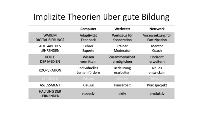 Nach meiner Erfahrung treffen in vielen Fällen unterschiedliche, zum Teil widersprüchliche Haltungen aufeinander, Grundannahmen darüber, wie Lernen ganz generell funktioniert. Dafür lässt sich der Begriff „Menschenbilder“ verwenden. Auch der Begriff „implizite Theorien“ ist passend. Denn die Grundannahmen über die Funktionsweise von menschlichem Lernen speisen sich aus eigenen Erfahrungen als lernende oder lehrende Person. Sie sind also empirisch belegt, und gleichzeitig so verfestigt, dass sie in der Regel nicht mehr als persönliche Meinungen wahrgenommen werden, sondern als bestätigte und allgemeingültige Theorie. Gleichzeitig sind diese Theorien implizit: Mir selbst ist also gar nicht klar, dass theoretische Grundannahmen Einfluss auf didaktische Entscheidungen haben.